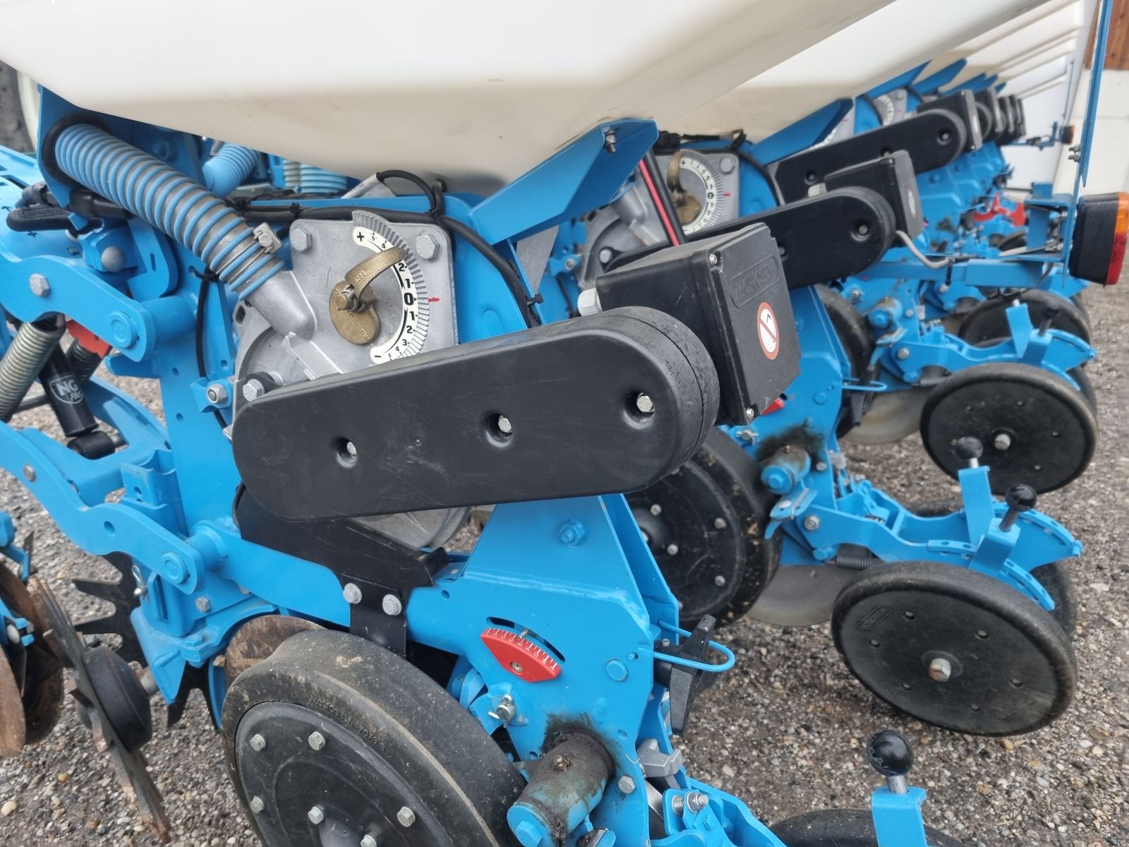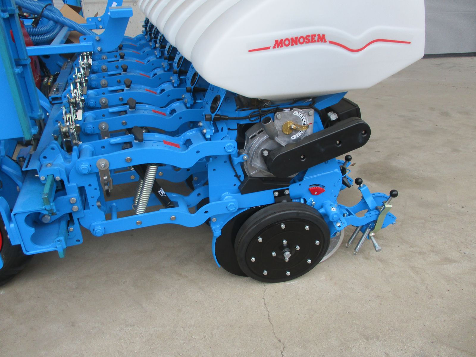 8 reihige Einzelkornsämaschine Reihenabstand verstellbar von 40-75cm in 2,5cm Schritte verstellbar, Pro Zwischenandruckrolle, Monoshox Elemente elektrisch angetrieben, Große Turbine GD geeignet für Sojaanbau, Tiefenführungsrollen 5cm breit, Beleuchtung, Preis ohne Microsem nur für Grundmaschine.